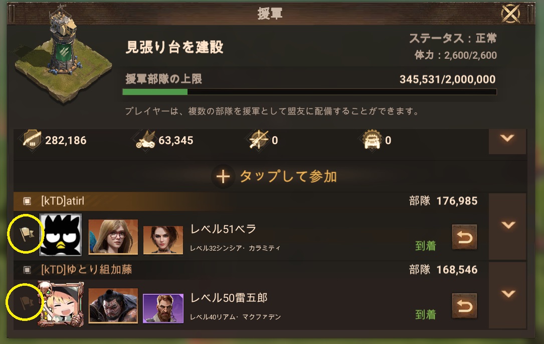上記画像の旗マークが白くなっているのが駐屯リーダーです。駐屯リーダーは、○で囲っている他の人の旗をクリックすれば、