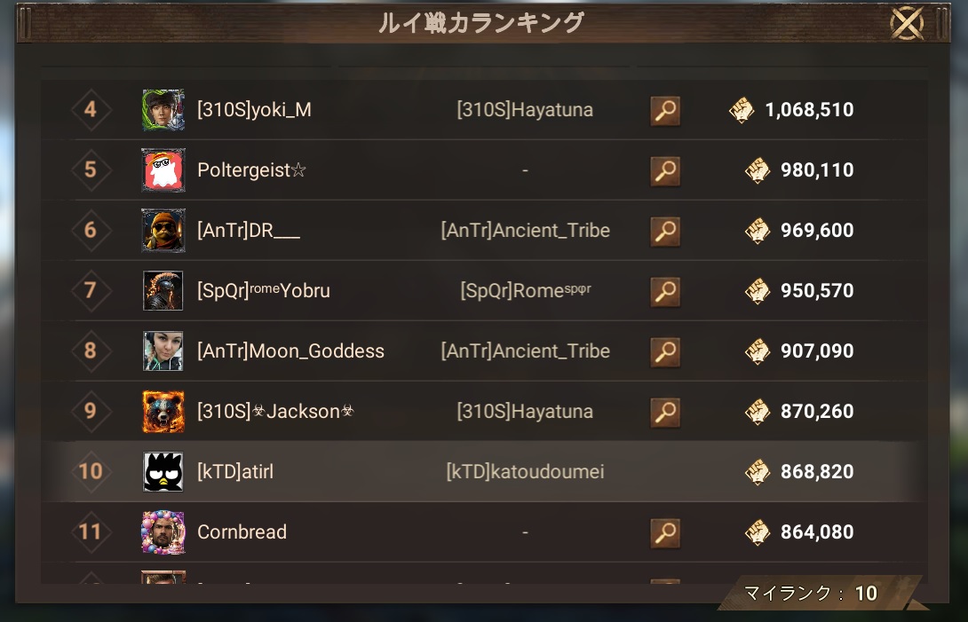 自分より戦力が高いアカウントが9つ(中身4人?)も増えた分、順位の下がり具合は当然として、ダメージが78M→60Mと大幅減になっている。